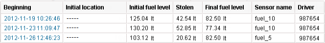 This report table allows you to find out when and where fuel thefts occurred. They are detected during stops and while the unit is parked, as well as while it is moving, provided that the Detect fuel theft in motion option is enabled. The parameters for this report are set in the properties of the fuel level sensor.