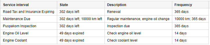 State | The overall state of the execution of the service work. In other words, it is the remaining or expired interval of mileage, engine hours, and days. |