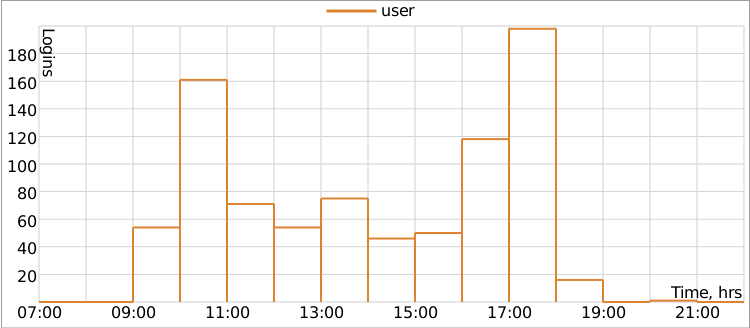Two kinds of charts can be attached to the report on user logins: Logins/Hours and Logins/Days of the week. To get these charts, click on the Add chart button and select the type in the drop-down list of the report template.