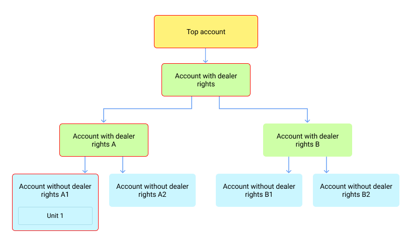 - When objects are created in a subordinate account, the rights to them are automatically given to the users indicated as creators in the vertical hierarchy. For example, in the image below, a unit has been created in the account without dealer rights A1. All the users who are indicated as creators and whose accounts have a red outline have received access rights to the unit.