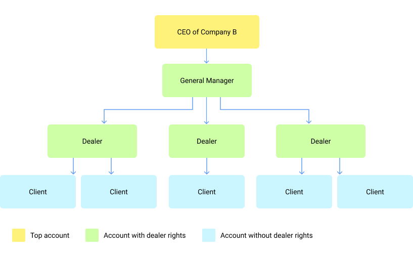 - Now the dealer can organize the hierarchy of subordinate accounts depending on the specifics of their business.