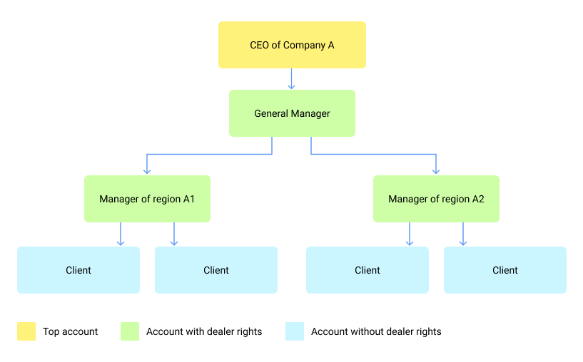 It is recommended to configure a hierarchy of at least three levels (top account, account with dealer rights, accounts without dealer rights). Depending on the specifics of your business, you may need a deeper and more extensive service structure.